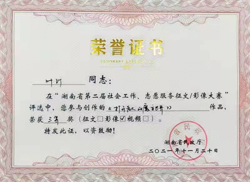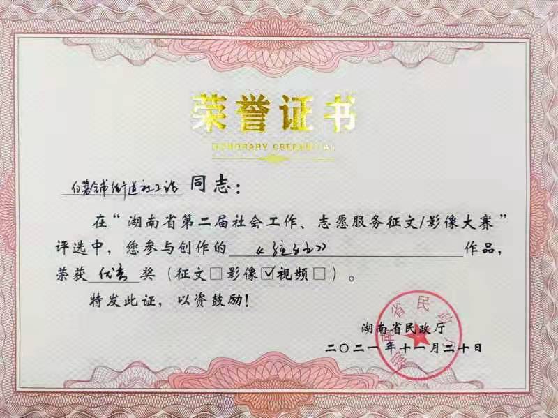 2021年,我司多名員工積極踴躍投稿參與由湖南省民政廳主辦、湖南公共頻道承辦的湖南省第二屆社會(huì)工作、志愿服務(wù)征文暨影像大賽。他們講述平凡而偉大的故事,展現(xiàn)社會(huì)工作者精神風(fēng)貌,傳播真善美,弘揚(yáng)正能量。其中兩篇原創(chuàng)征文作品、三幅原創(chuàng)影像作品在比賽中脫穎而出,榮獲一等獎(jiǎng)1個(gè)、三等獎(jiǎng)3個(gè)、優(yōu)秀獎(jiǎng)1個(gè)。